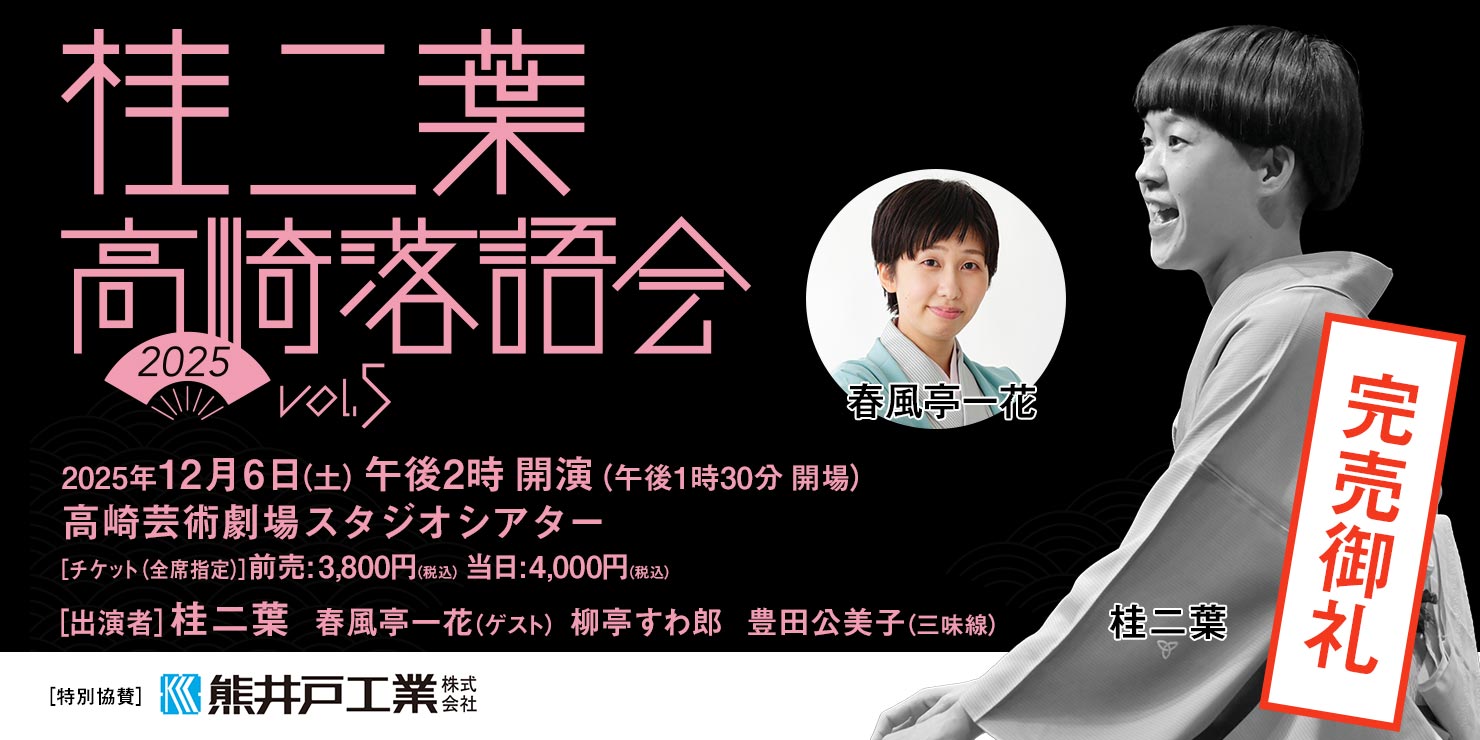 | 桂二葉 1986年、大阪市生まれ。大学卒業後の2011年3月9日、桂米二に入門。同年9月6日に初舞台を踏む。ふるき良き大阪ことばが息づく古典落語を大切にしながらも、新たな世界を予感させる高座に定評がある。入門以来、「女性が古典落語を演じるのは難しい」とされてきた定説に挑み続け、令和3年度NHK新人落語大賞では「天狗刺し」を披露し、女性として初の大賞を受賞。一躍、“最もチケットの取れない若手落語家”として注目を集める。メディアでも活躍の場を広げ、2021年にはKBS京都ラジオ『ま~ぶる桂二葉と梶原誠のご陽気に』がスタート。2023年にはABCテレビの人気番組『探偵!ナイトスクープ』に、女性落語家として初めて探偵として出演を果たすなど、テレビでも存在感を示している。 近年はドキュメンタリー番組で密着特集が組まれたほか、テレビCMにも出演するなど、活動の幅をいっそう広げている。自身で企画した独演会も好評を博し、古典落語の伝統に新たな息吹を吹き込む存在として注目を集めている。 「桂二葉高崎落語会」は2022年8月にスタートし、これまでに4回開催。すべて即完売となる人気ぶりで、高崎でも多くのファンの心をつかんでいる。 約三百年続く古典芸能・落語の世界に新風を吹き込む存在として、今、最も注目される落語家のひとりである。 ■ 公式サイト https://katsuraniyo.com/ |